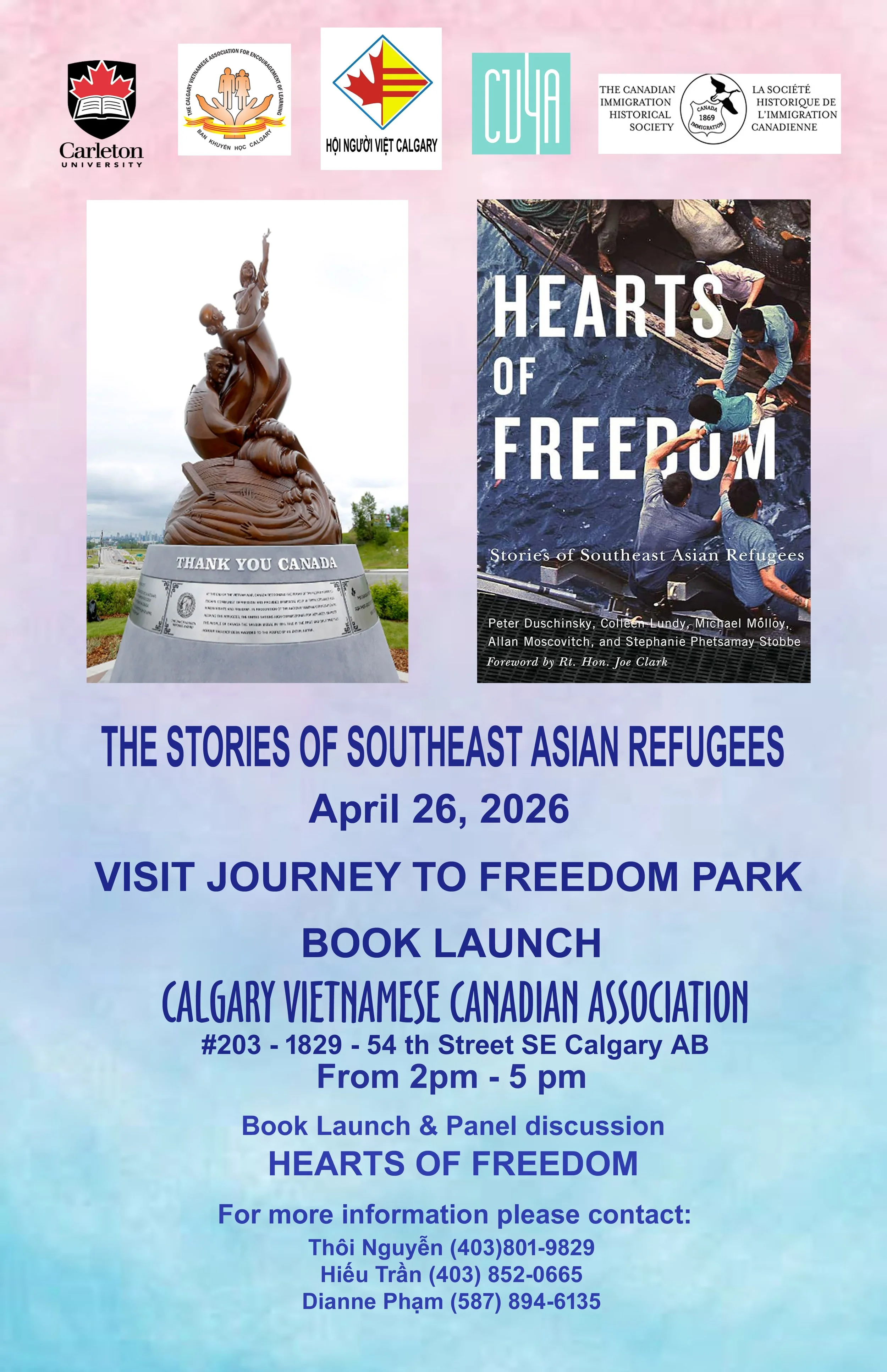 Hosted at the Calgary Vietnamese Canadian Association, this special afternoon will feature the launch of Hearts of Freedom, a powerful collection of stories that sheds light on the experiences of refugees from Southeast Asia. The event will also include a panel discussion with contributors and experts, offering deeper insight into the historical and personal significance behind these stories.